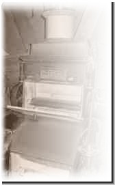 Schließlich beginnt die eigentliche Mahlung der Körner, wenn sie - wiederum über Elevatoren - zum Quetschstuhl (links) transportiert werden, von wo aus ihr Weg sie weiterführt zum Walzenstuhl (rechts). Dieser Weg führt über den sogenannten Plansichter, der durch eine Siebeinrichtung das Mehl aussondert, das bereits fein genug gemahlen ist. Wie oft der Mahlvorgang wiederholt wird, hängt nun davon ab, welchen Mehltyp man als Endprodukt herstellen möchte - je dunkler das Mehl ist, desto öfter durchlaufen die Körner diesen Prozess.